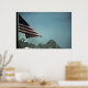 Fotografía de la bandera estadounidense ondeando en la brisa, sobre las montañas.