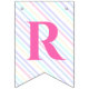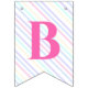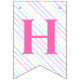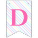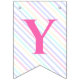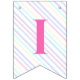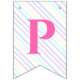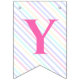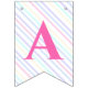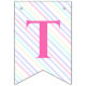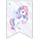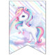 Bunting Flags en una mágica fiesta de cumpleaños con un adorable unicornio con alas en las nubes sobre un fondo arcoiris.