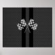 Se aplican banderas de carreras a cuadros representadas como un aplicativo cromado en una impresión de diseño de tipo fibra de carbono. El aspecto de la fibra de carbono se adapta a los gustos automotores, modernos e industriales, y la simulación 3D de las banderas permite un diseño dinámico.
