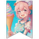Banner rosa, morado y azul de cumpleaños con hermosos chicas de anime con helados, pasteles de cumpleaños y pastelitos.