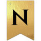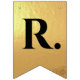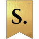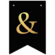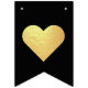 Una bandera de banderines para una boda con colores de boda negros y dorados, con las palabras "Sr. & Sra." y el apellido de la nueva pareja y 3 corazones. El texto está en mayúsculas negras sobre fondo de lámina de oro falso, los corazones y el símbolo ampersand son de lámina de oro falso sobre fondo negro.