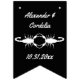 Este impresionante bunting Boda presenta una imagen de arte digital de un par de bellos escorpiones blancos que se enfrentan entre sí. Cada escorpión es blanco y tiene ocho patas, una picadura venenosa y un par de pinzas. Las pinzas se mantienen juntas para formar la forma de un corazón. El fondo es negro. Un hermoso diseño de Boda gótico. Hay un texto personalizado para que puedas incluir los nombres de la pareja feliz y la fecha Boda.