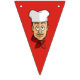 Cabeza del chef con gorra y pañuelo rojo de fondo.