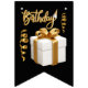 Este estandarte de bunting muestra la palabra "Cumpleaños" en una fuente de letra manuscrita cursiva con letras de color dorado y contorno blanco que presenta un sombrero de cumpleaños, serpentinas y regalo en este tema y estilo de cumpleaños. Todos los estandartes tienen impresión de un solo lado, seguros para exteriores, hechos con plástico rígido de poliestireno y una cuerda de plástico grueso tiene (16) banderines de cola de golondrina de 5,5" x 8" en una cuerda de 6' de largo.