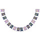 Las banderas tienen matices alternos de morado claro, morado oscuro y azul marino. Las letras son amarillas. Hay 2 cruces amarillas entre las palabras. El mensaje es "Dios te bendiga" seguido de un nombre de 6 letras que debes cambiar letra por letra (el predeterminado es Andrew).