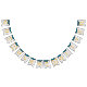 Una pancarta de afinamiento para eventos religiosos, recomendada para los niños, con fondo de mármol blanco, letras doradas y cruces entre las palabras y el geodoro azul en las fronteras superiores. El texto de la pancarta dice "Dios bendiga [Nombre]" donde el nombre tiene 6 letras - el predeterminado es Oliver. El ágate geodésico azul, con muchos matices de azul y turquesa, es de una foto de Robert Ramsay de Pixabay y es gratis para uso comercial.