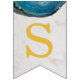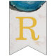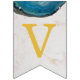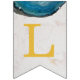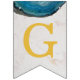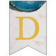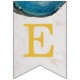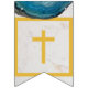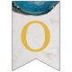 Una bandera de banderines para eventos religiosos, recomendada para niños, con fondo de mármol blanco, letras doradas y cruces entre palabras y ágatas de geoda azul en los bordes superiores. El texto del banner dice "Dios bendiga [Nombre]" donde el nombre tiene 6 letras - por defecto es Oliver.
