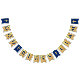 Banderas de conglomerado de oro azul para bautizos de niños, primeras comuniones o confirmaciones religiosas. Capas azules reales sobre un falso fondo de Relieve metalizado dorado, con 4 cruces de oro falsas sobre fondo azul real entre las palabras. El mensaje es "Dios bendiga" seguido de un nombre de 4 letras que debería cambiar letra por letra (el predeterminado es Liam). Hay cruces de oro al principio, al final y entre palabras.