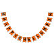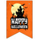 Feliz ilustracion de diseño de texto de Halloween con decoración de casa embrujada, cementerio y murciélagos en luna llena sobre fondo naranja de grano