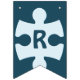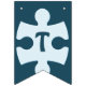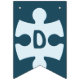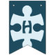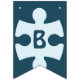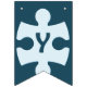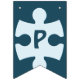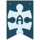 Fun Jigsaw Puzzle Pieces Happy Birthday Blue Bunting Flags feature a jigsaw puzzle piece with a custom image on top, adding a personal touch. It can be used to feature the puzzle theme. The rest of the flags spell the word "Happy Birthday", each flag holding one letter.