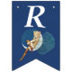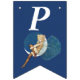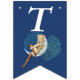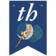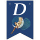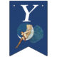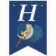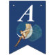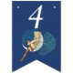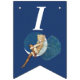 Esta bandera forma la bandera Feliz cumpleaños es azul oscuro con letras blancas y un hada de bonito con pelo rubio y alas azul claro sentadas en una luna creciente con medias de seda. Personalizar el año de cumpleaños con las plantillas.
