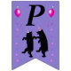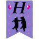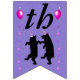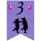 This flag shaped bunting Happy Birthday banner is purple with two happy black dancing bears wearing festive party hats accented with pink stars and vibrant pink balloons. Customise the Happy Birthday text and birthday year with the templates.