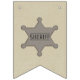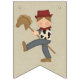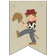 La pancarta divertida tiene un vaquero de pelo castaño en cada extremo y dice Feliz Cumpleaños con una insignia de Sheriffs entre las palabras. El vaquero lleva sus jeans azules, una camisa impresa de una vaca, una bandana roja y un gorra de vaquero rojo y está montando su poni de juguete. ¡Esta será una decoración tan bonita para un fiesta de vaqueros! También disponible en vaquero de pelo rubio y vaquero asiático.