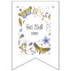 Esta pancarta muestra una colección de calcomanías de mariposas y flores de estilo azul/dorado con letras que muestran la frase "Ponte bien pronto" con un estilo tipográfico en este tema de Get Well Soon. Todos los banners tienen una caja fuerte al aire libre de impresión a un solo lado y hecha con gruesa cuerda de plástico tiene (16) banderas de 5.5" x 8" en una cuerda de 6' de largo.