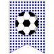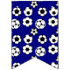 Un divertido banner de garland con un patrón de secuencia repetida que comienza con un fondo blanco a rayas en el que aparecen pelotas de fútbol en blanco y negro; a continuación se muestra un fondo azul marino sólido en el que aparece una plantilla blanca con la edad de los chicos de cumpleaños y, por último, un fondo blanco sobre el fondo azul marino en el que aparece un solo vector de fútbol.