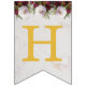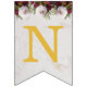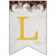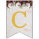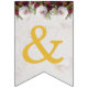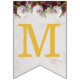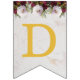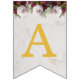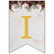 Una bandera de banderines florales apta para una boda, con los nombres personalizables de la novia y el novio, unidos por &. Hay 16 banderines, suficientes para un nombre de 7 letras y otro de 8 letras. Los nombres predeterminados son "Danielle & Michael". Gorras doradas sobre fondo de mármol blanco, con peonías burgundy y blancas en el borde superior. Las peonías vintage en el borde superior están pintadas por el pintor y botánico Pierre-Joseph Redouté (1759-1840) y ahora son de dominio público.