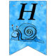 Este cartel con forma de bandera con la forma de "Happy Birthday" es una mezcla de tonos azul acuático con un lindo caracol con estampado azul tipo personalizado que sonríe y tiene ojos blancos redondos. Personalizar el año de cumpleaños con las plantillas.