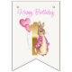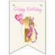 Peter el conejo con globos en forma de corazón rosado y Feliz primer cumpleaños