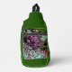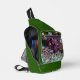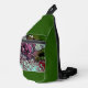 Mochila bandolera con rama de acebo con bayas moradas en relieve con efecto metálico sobre un fondo abstracto con motivos florales.