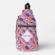 La bolsa de honda personalizada incluye la bandera de los Estados Unidos de América roja, blanca y azul con las letras de EE.UU. debajo, en los colores de la bandera. El diseño está embaldosado para un efecto artístico. Un espacio blanco de cuadrados escrupulosamente contiene un lugar para que tu nombre añada un toque personalizado. Si desea dar esto como un regalo personalizado, simplemente agregue el nombre de otra persona. Diversión de usar cuando viaja a reuniones familiares, grupos de viajes o clubes. Genial para volver a la escuela. Maravilloso regalo para la madre o el papá viajantes en el Día de la Madre o el Día del Padre.