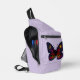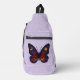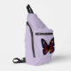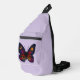 This striking butterfly illustration blends celestial symbolism with fierce, mystical energy. Saturated feathered rainbow hues are set against a star filled night sky. A glowing crescent moon rests in one upper wing, balanced by a radiant sun in the other. The lower wings reveal jewel green cat eyes, giving the piece an otherworldly presence. This cosmic boho artwork is set on lavender purple for an enchanting contrast. This unique sling bag is perfect for yoga, the beach, festivals and more.