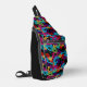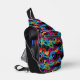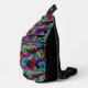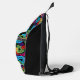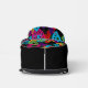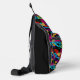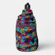 Diseño abstracto sobre fondo negro con entramado de hojas verdes de césped que simboliza el punto en común de España y Nueva Zelanda por ser antípodas. Las rodajas de kiwi neozelandeses se confunden con los abanicos españoles, con el color rojo pasión y tonos rosas de España, el azul del Mediterráneo y el verde de Nueza Zelanda.