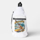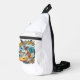 Un perro Boxer de color marrón y blanco se sienta orgullosamente sobre una tabla de surf mientras se desliza sin esfuerzo en una enorme ola alrededor de una isla tropical.