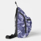 Este bolso presenta un bonito patrón de estilo de camo en tonos azules, grises y blanquecinos. Su monograma de triple letra está en blanco dentro de un cartel de círculo azul en el bolsillo.