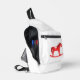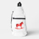 Este impresionante bolso de Navidades presenta una imagen de arte digital de un lindo caballo balancín al estilo escandinavo. El caballo es rojo con un mané rojo oscuro, cola y pezuñas. El caballo amistoso sonríe. Tiene una silla blanca y riendas con motivos folclóricos escandinavos bonitos en la silla, incluyendo el sol, la luna y las estrellas y los corazones y flores. La base del mecedor es roja y está cubierta de hojas blancas de bonito. El diseño se inspiró en el caballo Dala sueco.