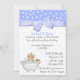 Pequeña invitación a la ducha de bebé, hecha en azul y blanco, con puntos de polka y un gran arco azul pálido. Adorables obras de arte de campo de un bebé en una bañera en la parte inferior izquierda. Personalice el texto que se adapte a sus necesidades de fiesta de ducha. Invitación, sellos coincidentes, pegatinas de sobres y sobres disponibles.