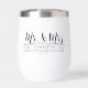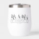 Especialmente para los recién casados, este diseño de vaso de vino termal incluye un hermoso texto de guión de 'Mr & Mrs.'. Una pancarta decorada con corazones sostiene tu apellido mientras que debajo se puede añadir una cita boda. Las gafas de personalizado hacen un gran regalo de boda, ducha de novia, de mudanza o de anfitriona. Busque ID668 para ver otros productos con este diseño.