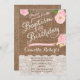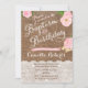 Un bautismo rústico pero a la vez bonito y una invitación al cumpleaños (a cualquier edad) para el gran día de tu niñita. El fondo es un efecto burlap con escritura y revestimiento de encaje. Todo ello complementado con detalles de flores de color rosa bonito.