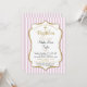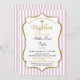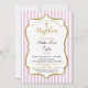 Una elegante invitación al bautismo de chicas en rosa y oro, con rayas rosas y blancas y marco de texto purpurina dorado junto con una cruz purpurina de oro. El marco de texto purpurina de esta elegante y clásica invitación bautismal presenta una sombra que le da un aspecto elevado.