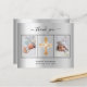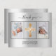 Añade 3 de Tus fotos, tamaño vertical, una fecha, nombre y la nota de agradecimiento. Un fondo falso de aspecto plateado con texto negro y marco. El texto: Gracias en la parte delantera y tu nombre en la parte trasera está escrito con un elegante guión con letras a mano con barras.