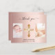 Personalice y agregue 3 de sus fotos, tamaño vertical, fecha, nombre y nota de agradecimiento. Una rosa de moda dorada imita el fondo metálico con texto negro. El texto: Gracias en la parte delantera y sus nombres en la parte trasera están escritos con un elegante guión con letras a mano con guiones.