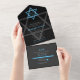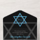 Invitación de Bar Mitzvah con Estrella de David negra, azul y gris y tarjeta de RSVP todo en una sola invitación. Los símbolos de la Estrella de David se pueden eliminar en la herramienta de diseño si no los desea o si desea solo algunos de ellos. Los colores de esta invitación son negro, azul y gris. Colores clásicos que son masculinos, elegantes y con estilo. Todos los colores de esta invitación también se pueden cambiar en la herramienta de diseño.