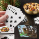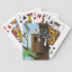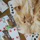 Un lindo gato tabby está durmiendo en una casa de pajar de madera. Los pájaros que viven ahí no son felices.