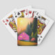 Estas cartas de juego tienen una casa rosada sobre ellas.