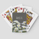 Modern personalized playing cards with sunny daisies on dark grey background.