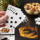 Este diseño presenta un feliz saludo de Halloween con una imagen de luna llena iluminada en un espeluznante tono de naranja brillante. También se puede ver una casa embrujada y murciélagos volando en el aire. Junto al texto hay dos pequeñas imágenes: una de un gato y otra de una calabaza, ambas asociadas con Halloween.