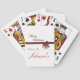 Hermosamente detallado texto de oro Feliz Navidad. Una cinta roja cruza las cartas de juego y tiene dos campanas doradas para un tema de Navidades festivos. Añade tu propio texto personalizado.