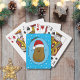Adorable y divertida patata de dibujos animados marrón con un gorro de Santa rojo y blanco. La patata está en un estilo de arte de dibujos animados y coloreada marrón, tiene brazos y dedos de palito y una gran sonrisa feliz con puntos para los ojos. El gorro de Santa en su cabeza es rojo con un borde blanco y un pompón blanco colgando. Está dentro de una forma ovalada azul claro con un marco azul oscuro y dos hojas de acebo verdes con dos bayas rojas en la parte superior del óvalo. El color de fondo es un azul claro brillante con copos de nieve blancos flotando alrededor para darle un ambiente festivo a estas divertidas tarjetas de temporada.