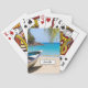 Jugar cartas personalizadas con una idílica escena de playa tropical. Agua azul turquesa cristalina y una playa de arena fina de color marrón. Algunas hojas de palmera cuelgan desde arriba. En la playa hay una vieja barca de madera. Un paisaje tranquilo y sereno.