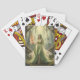 Una hermosa hada con un vestido verde claro y fluido y joyas hechas de peridotos con piedras de peripunto en su largo cabello verde claro y translúcido, alas de libélula con un gladiolo camina por un mágico bosque rodeado de flores rosas y azules y árboles cubiertos de viñas.