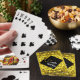 Tarjetas de juego creativas para fiestas de graduación con diseño de gorras negras y línea divertida sobre fondo dorado.