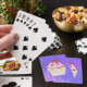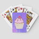Jugar a las cartas con un ilustracion de una deliciosa pastelita. Escarcha rosa y lloviznas de chocolate. Un portapapeles amarillo y una frambuesa encima. ¡Yummy! El fondo es una textura púrpura abstracta con pequeños corazones rociados alrededor.