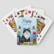 A sweet personalized playing cards with a cute illustration of a black and white cat surrounded by flowers and butterflies in a paper quilling impasto style.