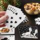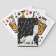 Esta baraja de cartas de juego está cubierta de negro con notas musicales blancas y un gato blanco y sonriente feliz que cruza las teclas del piano mientras disfruta de un guiño.