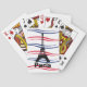 Ilustracion de la Torre Eiffel sobre fondo ondulado azul, blanco y rojo