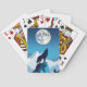 Cartas jugando en una silueta negra de un lobo, aullando a una gran luna llena, paradas en un pico de montaña con montañas cubiertas de hielo en el fondo